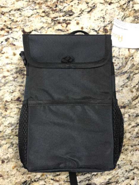 This is a well constructed and sturdy trash bag. The 2 features that I like best are the multiple straps so you have a few different ways to secure it and that it has clips to secure a plastic grocery bag inside for easier clean up. The velcro top with the unique opening allows you to easily place things inside one-handed, but keeps them well contained and out of sight.